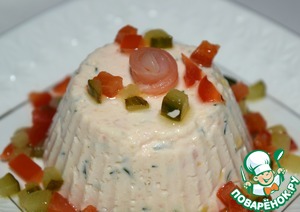 Быстро вмешать желатин в рыбно-сырную массу и наполнить ею силиконовые формочки, смазанные растительным маслом (4 формы по 70 мл). Накрыть формочки фольгой или пищевой пленкой и убрать закуску минимум на час в холодильник (на 2 часа, на ночь...).
