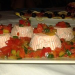 Формочки с застывшей уже закуской перевернуть на тарелки и подавать с обжаренными овощами.
