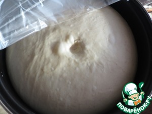 Посуду с тестом накрыть пищевой пленкой и поставить в теплое место примерно на 1 час. Оно должно увеличиться в 2-3 раза. Брожение теста закончено, если при надавливании в нем остается ямка