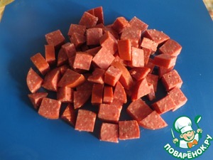 От теста отделить кусочек размером со среднее куриное яйцо, расплющить в лепешку, положить немного колбасы, посыпать сыром.