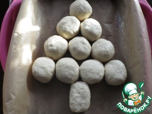 Края лепешки поднять вверх и хорошо защипать. Таким образом приготовить 10 круглых булочек. Одиннадцатую булочку сделать прямоугольной-это будет ''ствол''