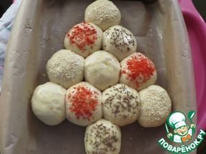 Выложить булочки на смазанный маслом противень следующим образом:наверху 1 шт., второй ряд-2 шт., третий ряд-3 шт., четвертый-4 шт., внизу ''ствол''
