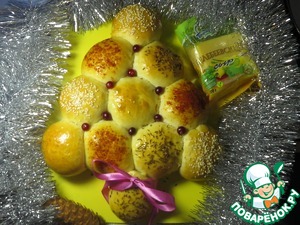 Предлагаю несложный рецепт вкусных булочек, празднично оформленных. Приготовление не занимает много времени, т. к. практически никакой возни с начинкой, что так важно в предновогодней суете! И за продуктами не нужно специально бежать в магазин, ведь наверняка такой набор имеется практически в каждом холодильнике! Такую ''елочку'' можно взять с собой в гости в качестве подарка.