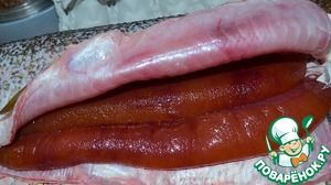 В моем случае - 500 г "янтаря" от 3,8 кг красавицы - хищницы. Аккуратно достать икру, не нарушив ястык (пленку). -