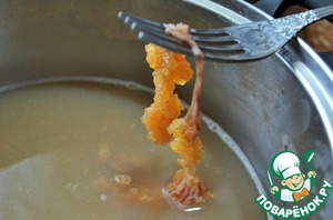 Вскипятить 1 литр воды со 100 гр соли и залить кипящим икру, интенсивно перемешивая вилкой. При этом пленка свернется и будет накручиваться на вилку.