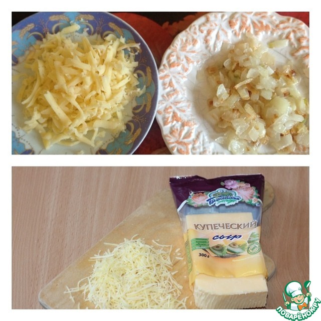 • Лук нарезать маленьким кубиком и обжарить до золотистого цвета в небольшом количестве растительного масла. Сыр натереть на крупной терке.
