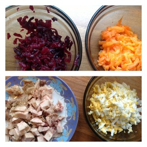 • Яйца, морковь, свеклу очистить и натереть на крупной терке. Окорочка предварительно пожарить или запечь в духовке, охладить ( не заменять на вареную курицу). Нарезать маленьким кубиком.