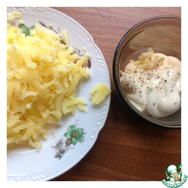• Картошку очистить и натереть на крупной терке. К майонезу добавить смесь перцев и чеснок пропущенный через пресс. Перемешать нашу заправку. Собрать салат слоями: