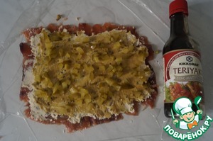 • Подготовленный сыр выложить на подготовленную рыбу и намазать ровным слоем по всей ее площади.
