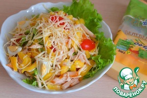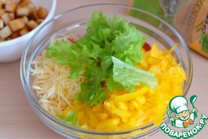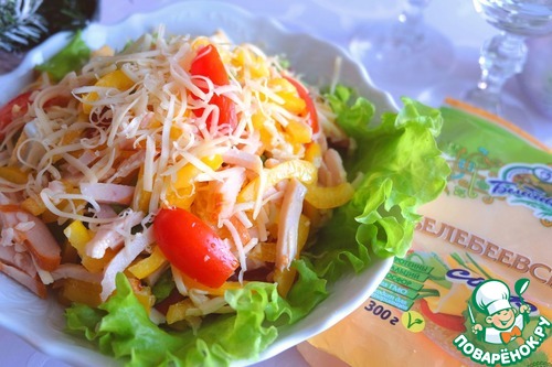 Салат перемешать. Заправит салат чесночным маслом (3 ст. ложки), добавить сок лимона (2 ст. ложки). Салат посолить по вкусу, сверху посыпать натертым на терке сыром ТМ "Белебеевский".
