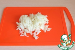 Порезать мелкими кубиками репчатый лук.