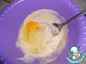 К творогу добавить сахар, яичные желтки, лимонный сок. Перемешать. Ввеети взбитые белки, аккуратно перемешать.