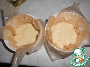 Формочки для выпечки диаметром 9-10 см выложить бумагой для выпекания (понадобится 4 формочки, у меня таких только 2 формы и остальную часть я выпекала в силиконовой формочке для кекса. Выложить тесто равномерно по 4 формочкам ( примерно толщиной 1,5-2 см.)