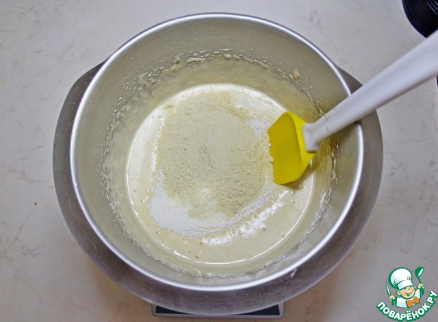 Во взбитые яйца аккуратно ввести миндальную муку и просеянную пшеничную муку и аккуратно перемешать.