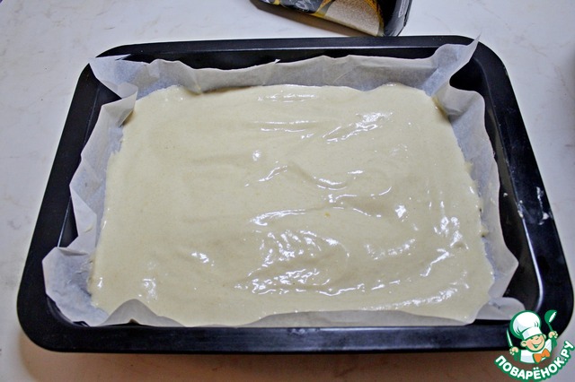 Вылить тесто в форму выстеленную пергаментом. Форма моя 25 на 35 см.
