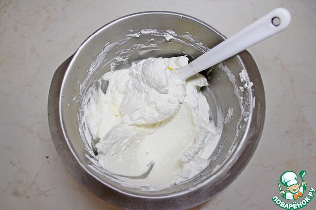 Для приготовления крема сливки не менее 33 % жирности взбить до пиков с сахаром, добавить творожной сыр без добавок и снова взбить.
