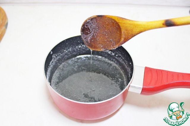 Для приготовления белкового крема в сотейник всыпать сахар и влить воду, поставить на огонь, довести до кипения и варить на медленном огне 5-6 мин до температуры сиропа 122 гр или как показано на фото чтобы за ложкой тянулась ниточка.