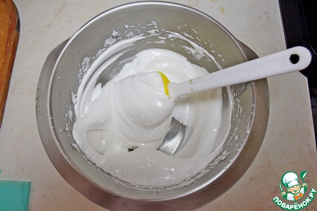 Тем же временем пока варится сироп, в чаше миксера взбиваем белки до пиков, затем тонкой струйкой влить горячий сироп при этом миксер должен взбивать на высокой скорости.