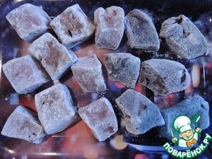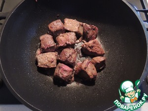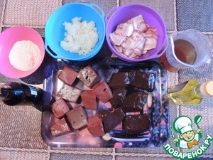 Печень режем довольно крупно, кубиками примерно 5*5 см. Бекон режем произвольно, можно кубиками или полосочками. Лук режем мелко.