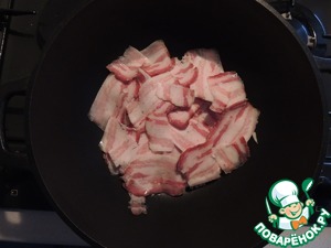 Берем сковороду с антипригарным покрытием, добавляем немного оливкового масла или любого другого растительного, начинаем обжаривать лук и бекон. Я немножко сглупила и обжарила лук вместе с беконом, но нужно это делать по отдельности, так как бекон необходимо довести до хруста, а лук за это время превращается в угольки.