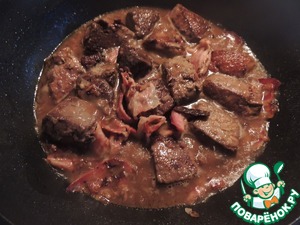 Возвращаем сковороду на огонь и вливаем 3 ст. л. бальзамического уксуса и 250 мл мясного бульона, перемешиваем и выкладываем печень и лук с беконом. И тушим еще минут 5 до готовности печени.