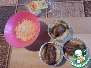 Берём формочки для выпечки из фольги и начинаем собирать наше блюдо. На дно каждой формочки выкладываем картофельное пюре, сверху кусочек печени и бекон, немножко утапливаем печень в пюре
