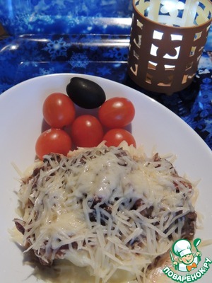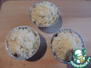 Засыпаем всё сливочным сыром и ставим духовку минут на 5: только чтобы сыр расплавился.