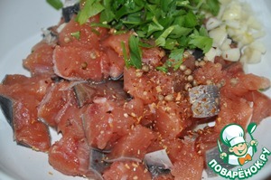 Добавляем к рыбе: мелко рубленные чеснок и зелень кинзы, хлопья перца чили, зёрна кориандра и растительное масло.