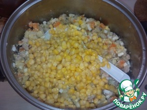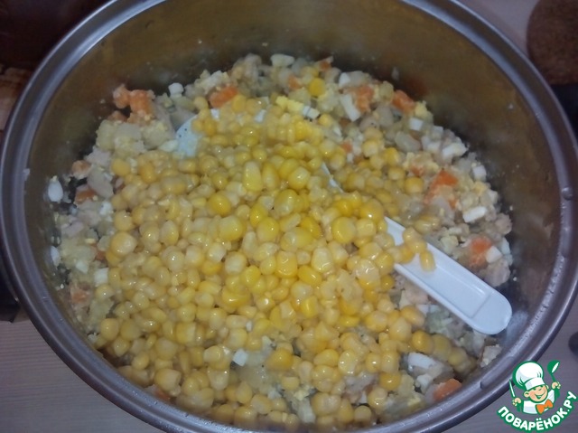 Порезать вареные овощи, яйца. Добавить кукурузу. Добавить готовую грудку.