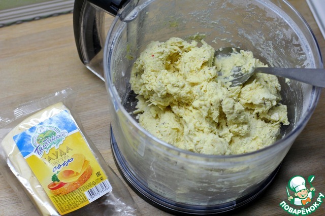 Сыр потереть на крупной тёрке и порезать ножом, чтобы получились маленькие квадратики.