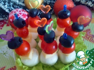 Нанизываем поочередно подготовленные ингредиенты на шпажки. Маслина, помидорка черри, сыр твердый, моцарелла.