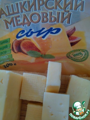 Твердый сыр нарезаем кубиками. Я использовала Белебеевский "Башкирский медовый".
