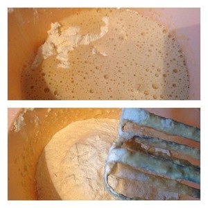 Добавить масло и творог. Взбить минуты 2, не меньше. Всыпать разрыхлитель и муку, взбить до однородного состояния.