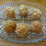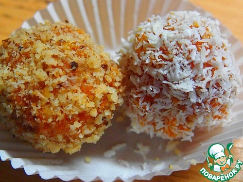 Из морковно-ореховой смеси сделать маленькие шарики и обвалять их в оставшихся орехах или в кокосовой стружке.