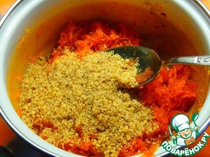 Орехи размельчить в блендере. Половину орехов всыпать к остывшей моркови и хорошо все перемешать.