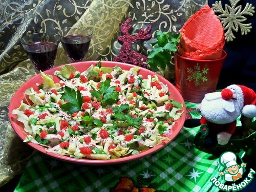 Новый год, говорят, надо встретить с яркими блюдами. Предлагаю отведать простой салат с минимумом ингредиентов, готовить можно буквально перед приходом гостей, если показалось, что не достаточно закусок на столе. Зелень используем любую.