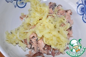 Сваренный в "мундире" картофель чистим, натираем на крупной тёрке.