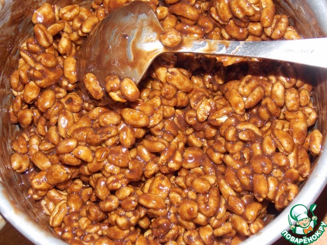 Снять с огня и всыпать воздушную пшеницу, перемешать и разложить по креманкам.