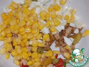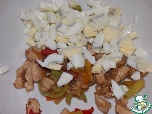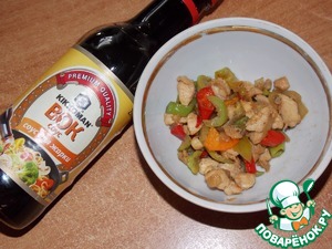 Куриное филе и лук нарезать маленькими кубиками, обжарить на растительном масле в течении 5 минут. Влить 1ст. л. соевого соуса, добавить нарезанные тонкими полосками болгарский перец. Жарить на медленном огне 5-7 минут.