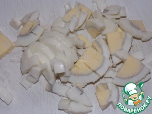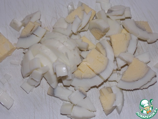 Добавить измельчённую морковь по-корейски и майонез. Перемешать, посолить и поперчить. Разложить салат по тарталеткам.
