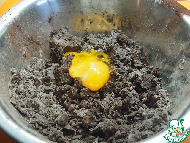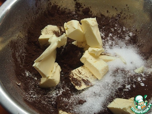 Из муки, разрыхлителя, какао, сахарной пудры, ванильного сахара и мягкого масла вымесить крошку.