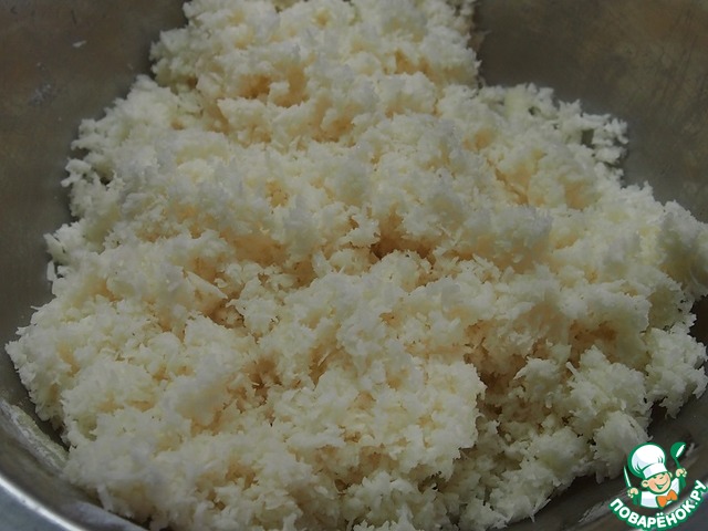 Начинка готовится очень просто: смешать кокосовую стружку, сахарную пудру, растопленное масло и яичный белок. Все перетереть пальцами, получается масса, из которой можно слепить, например, шарик.