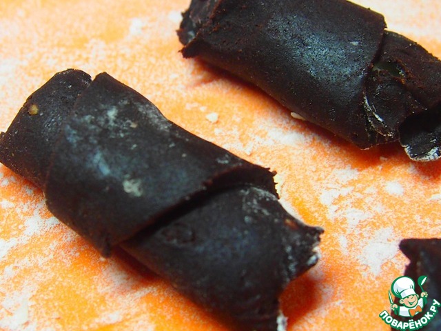 Разделить круг на восемь треугольников. Из кокосовой массы слепить маленькую "колбаску" и положить ее на широкую сторону треугольника.