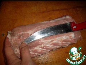 Для этого блюда необходима свиная отбивная (биток, балык, карбонад - кто как и где называет). Мясо зачистим, промоем и немного просушим. Отступаем от ровного края 1...2 см и делаем глубокий надрез почти до конца...