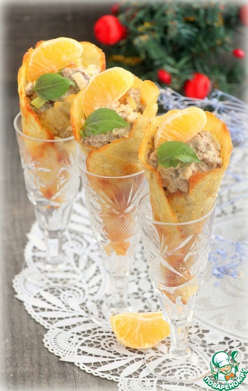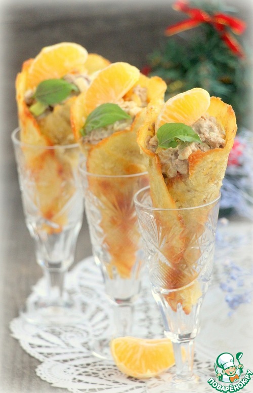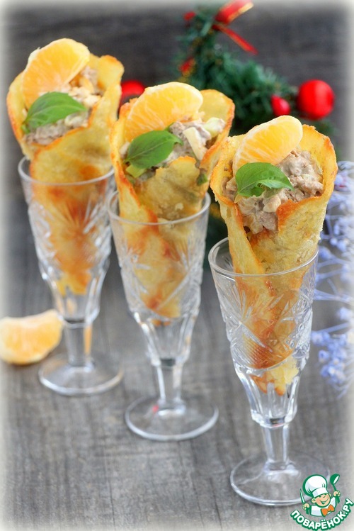 Рецепт «Мандариново-печеночный салат в сырных рожках»: