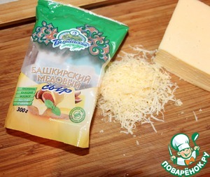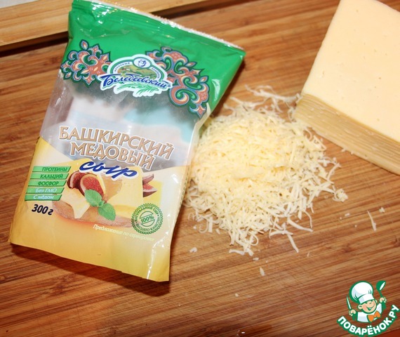 Готовим сырные трубочки. Натереть на мелкой терке Башкирский медовый сыр МК «Белебеевский». Он обладает незабываемым медовым вкусом и тонким, мягким послевкусием.