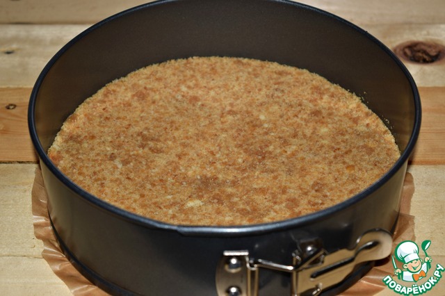 Выложить крошку из печенья в форму и равномерно распределить по дну, плотно утрамбовать рукой или ложкой.