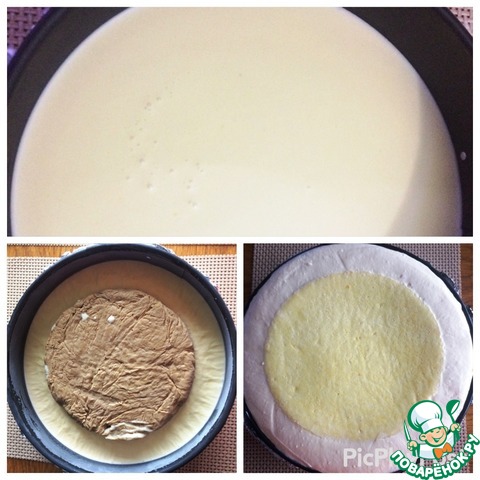 Форму застелить пленкой, если не силиконовая), бока выложить кондитерской лентой (я не делала).