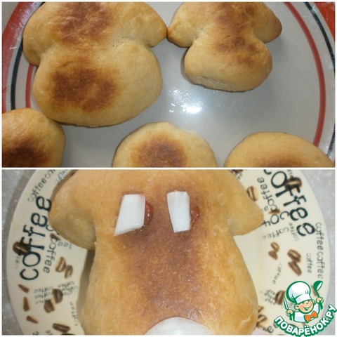 Из шести маслинок вырезаем глазки и носик. Чтобы они лучше держались на мордочке, смазываем края стыка оставшимся яичным белком. Украшаем наши булочки. Даём расстояться 30-50 минут.