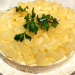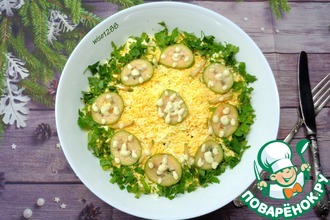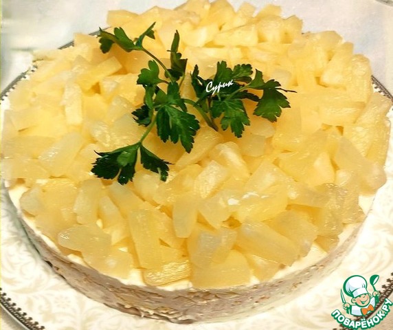 Консервированный ананас нарезать кусочками и плотно уложить поверх салата. Рекомендую покупать ананас в колечках и нарезать его вручную, по какой-то странной причине кольца ананаса кажутся вкуснее, чем готовые кусочки из банки.